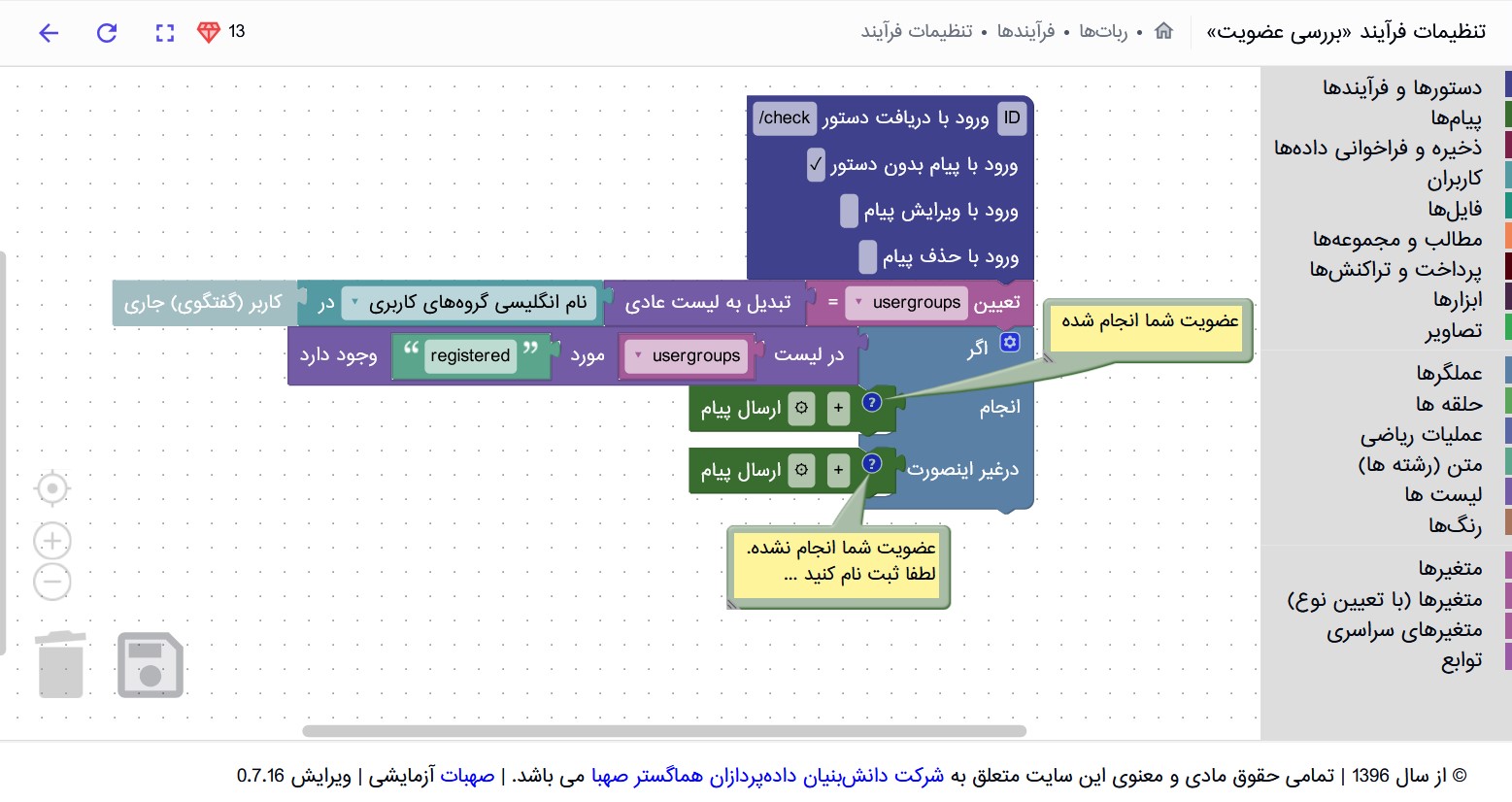 توجه داشته باشید که چند نمونه از رباتهای قابل ساخت در سایت اصلی معرفی شدهاند. همچنین میتوانید در محیط کاربری صهبات، از بلوکهای فرآیند پیشرفته کپی کنید. در آینده امکان کپی برداری از رباتهای نمونه نیز فراهم خواهد شد.
