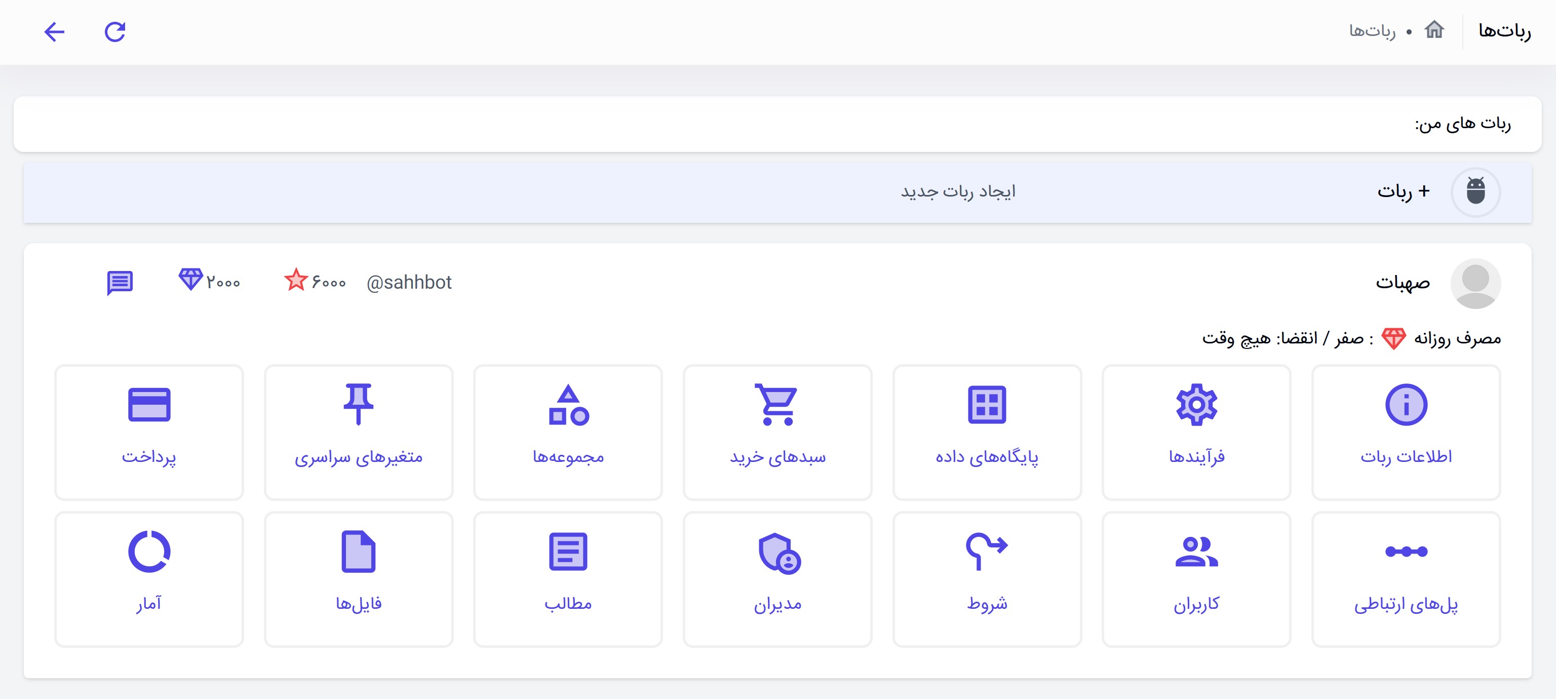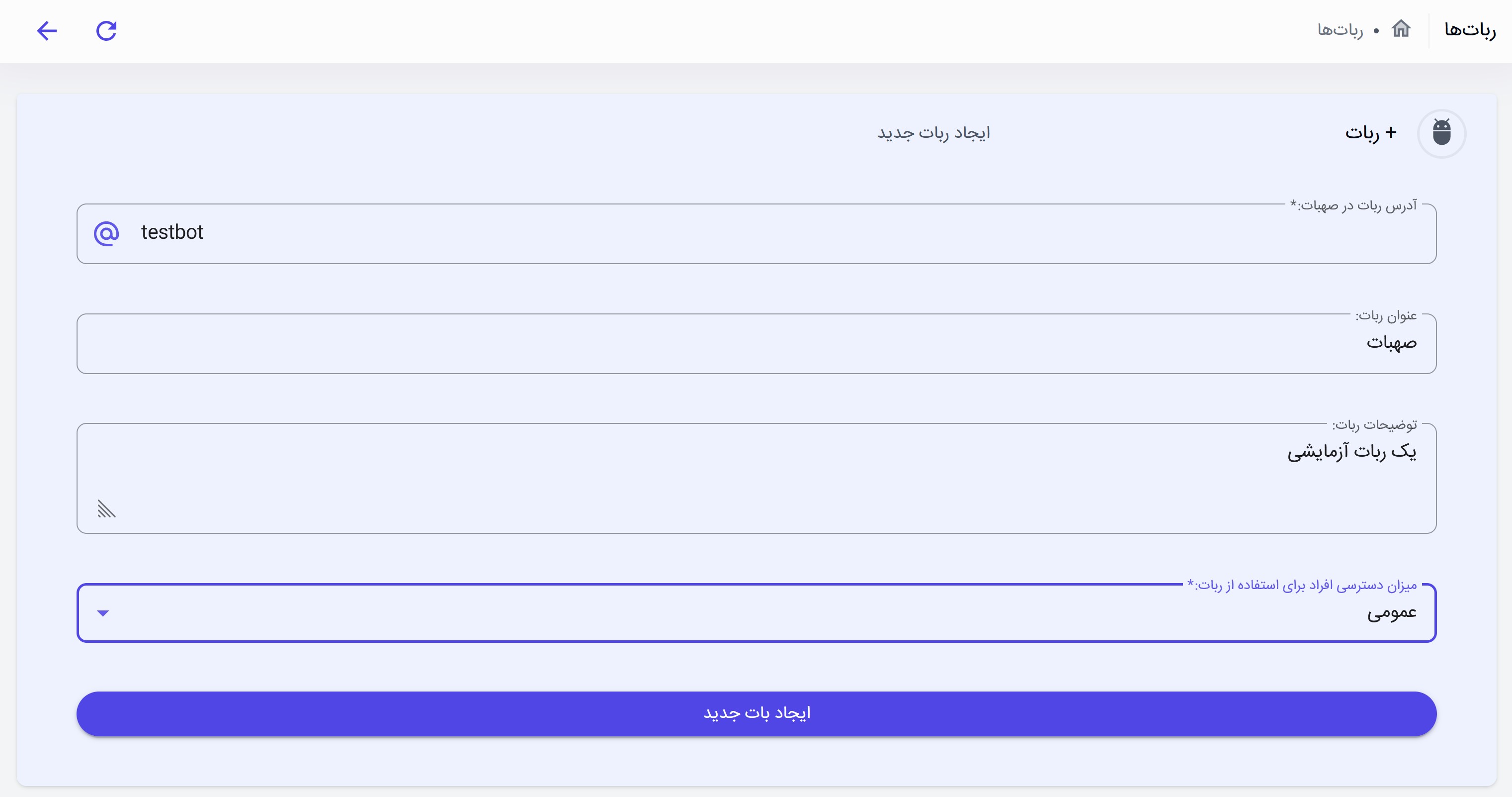 قسمت رباتها، بخش اصلی راهاندازی رباتهای دلخواه است. با ورود برای اولین بار نیاز است یک ربات جدید ایجاد کنید. قسمت های ستارهدار اجباری هستند. توجه داشته باشید تعیین میزان دسترسی افراد برای استفاده از ربات به این صورت است که عمومی برای مشاهده ربات توسط همه از جمله کاربران مهمان، کاربری برای مشاهده ربات تنها توسط کاربران صهبات و خصوصی برای مشاهده تنها توسط خود کاربر است. پیشنهاد میشود این مورد را روی عمومی قرار دهید.