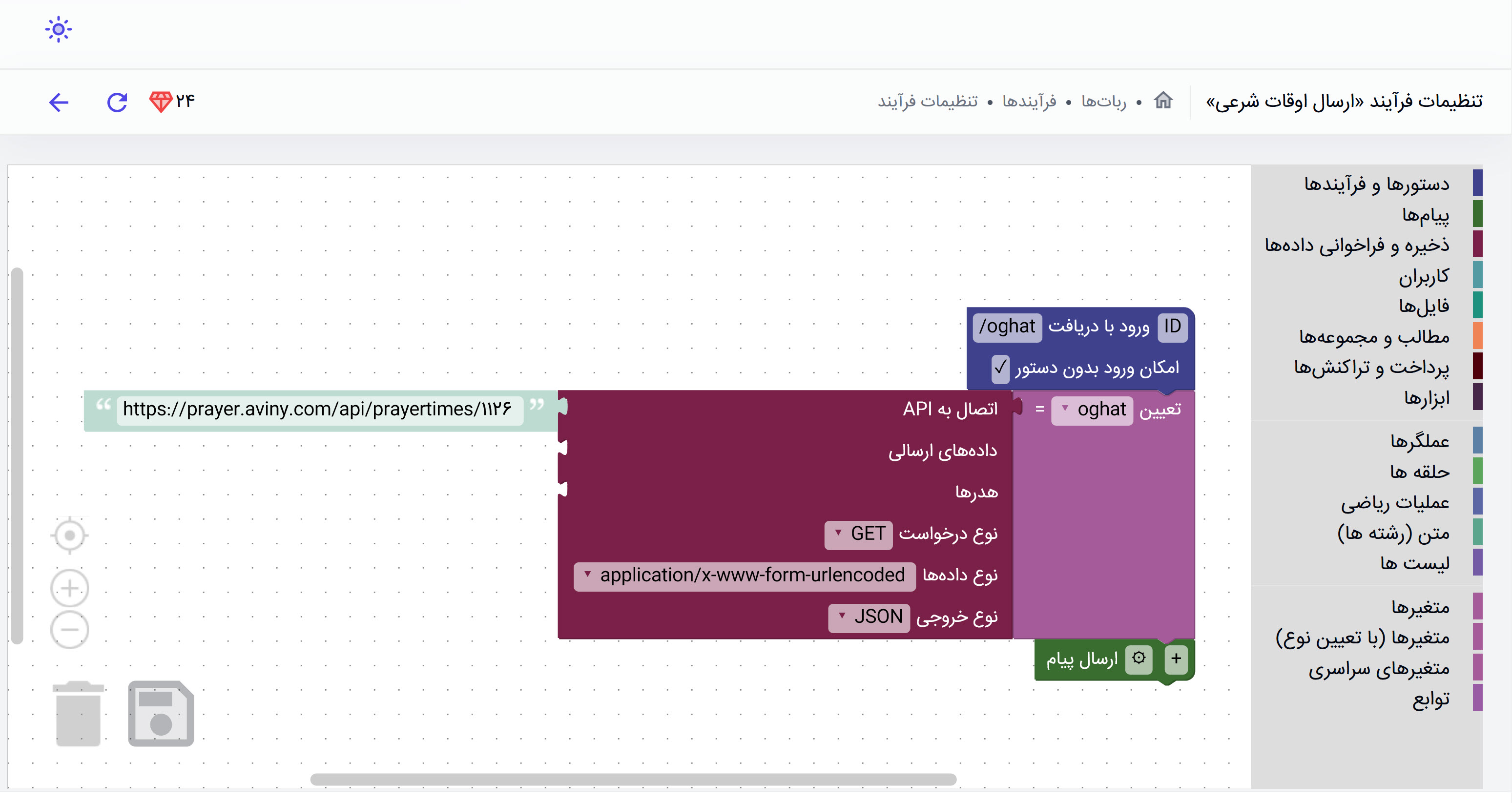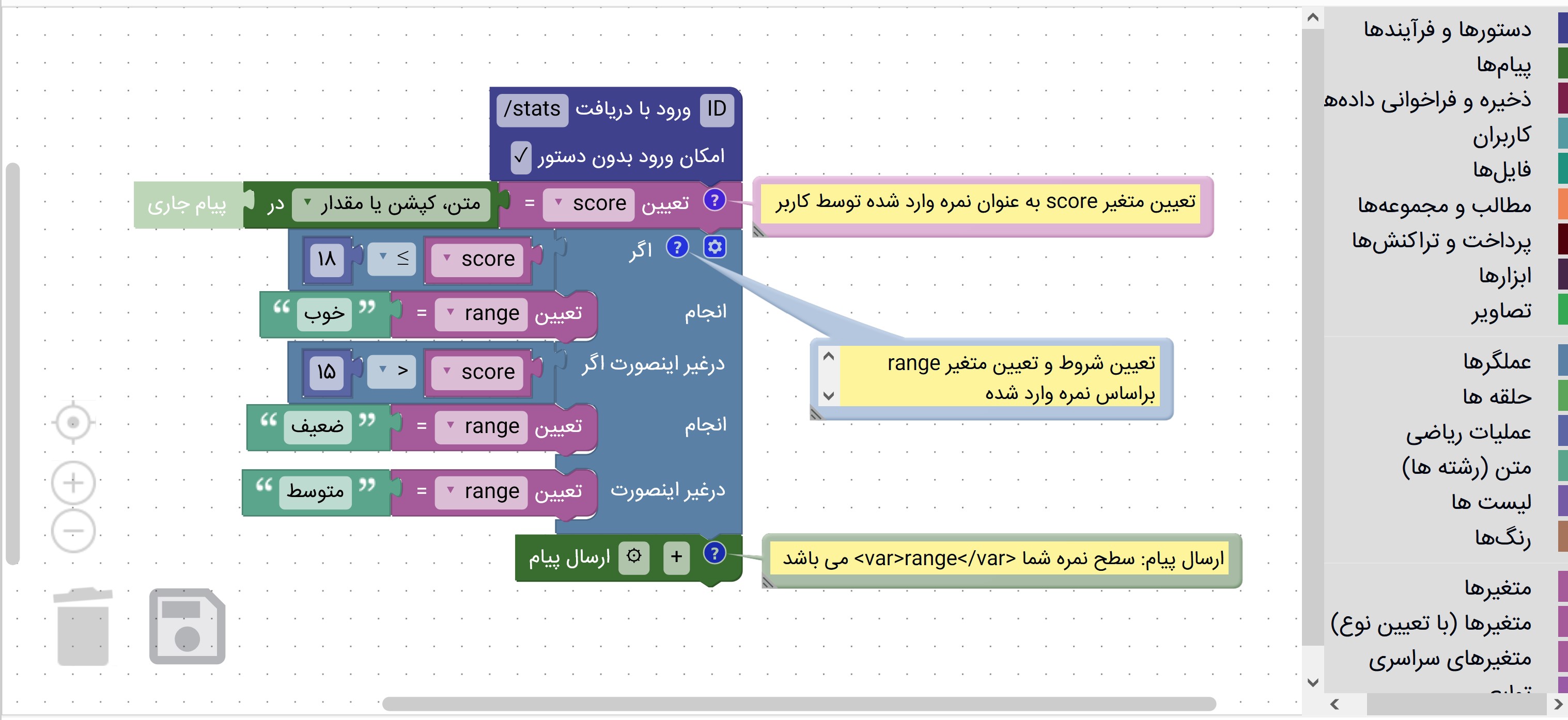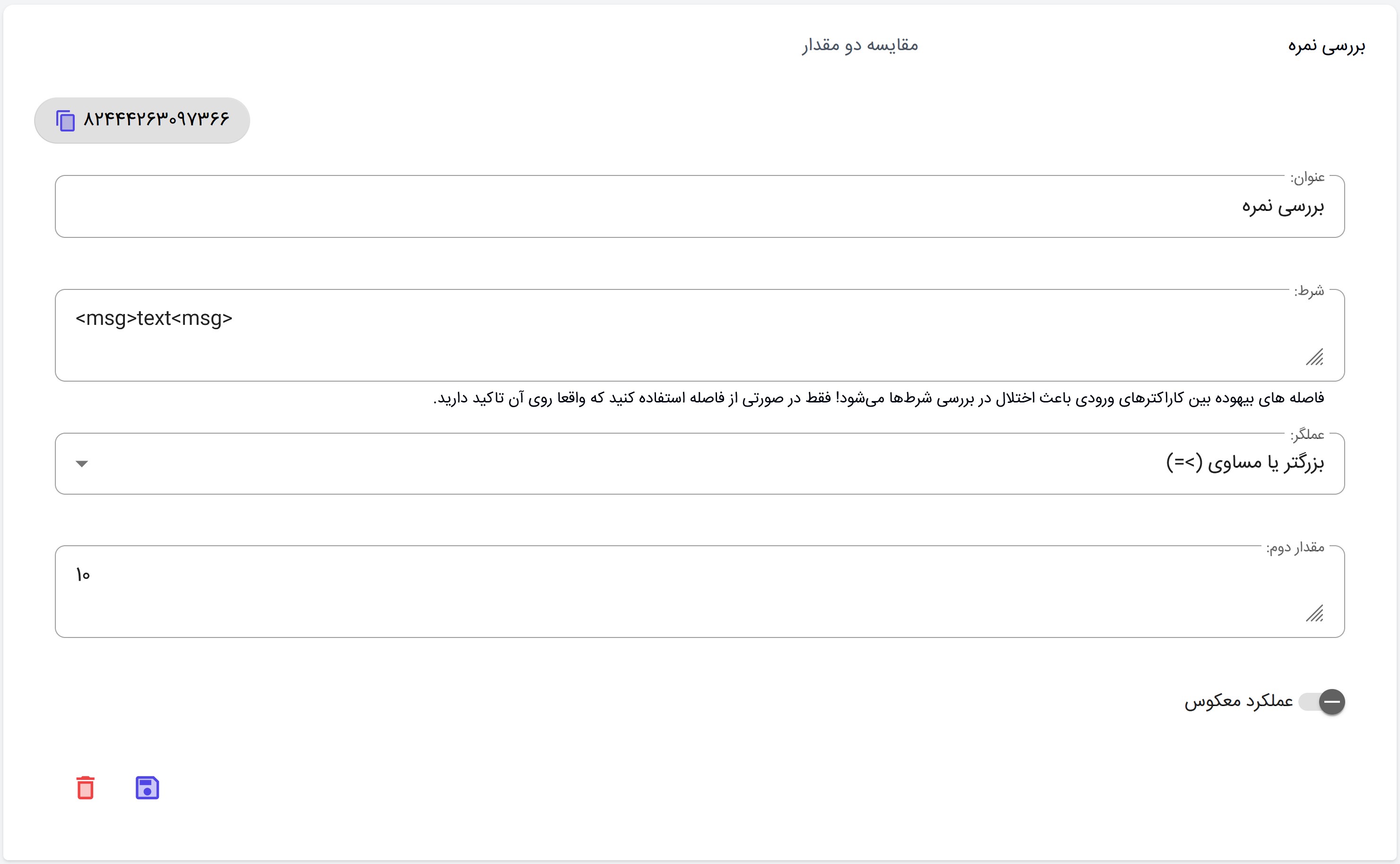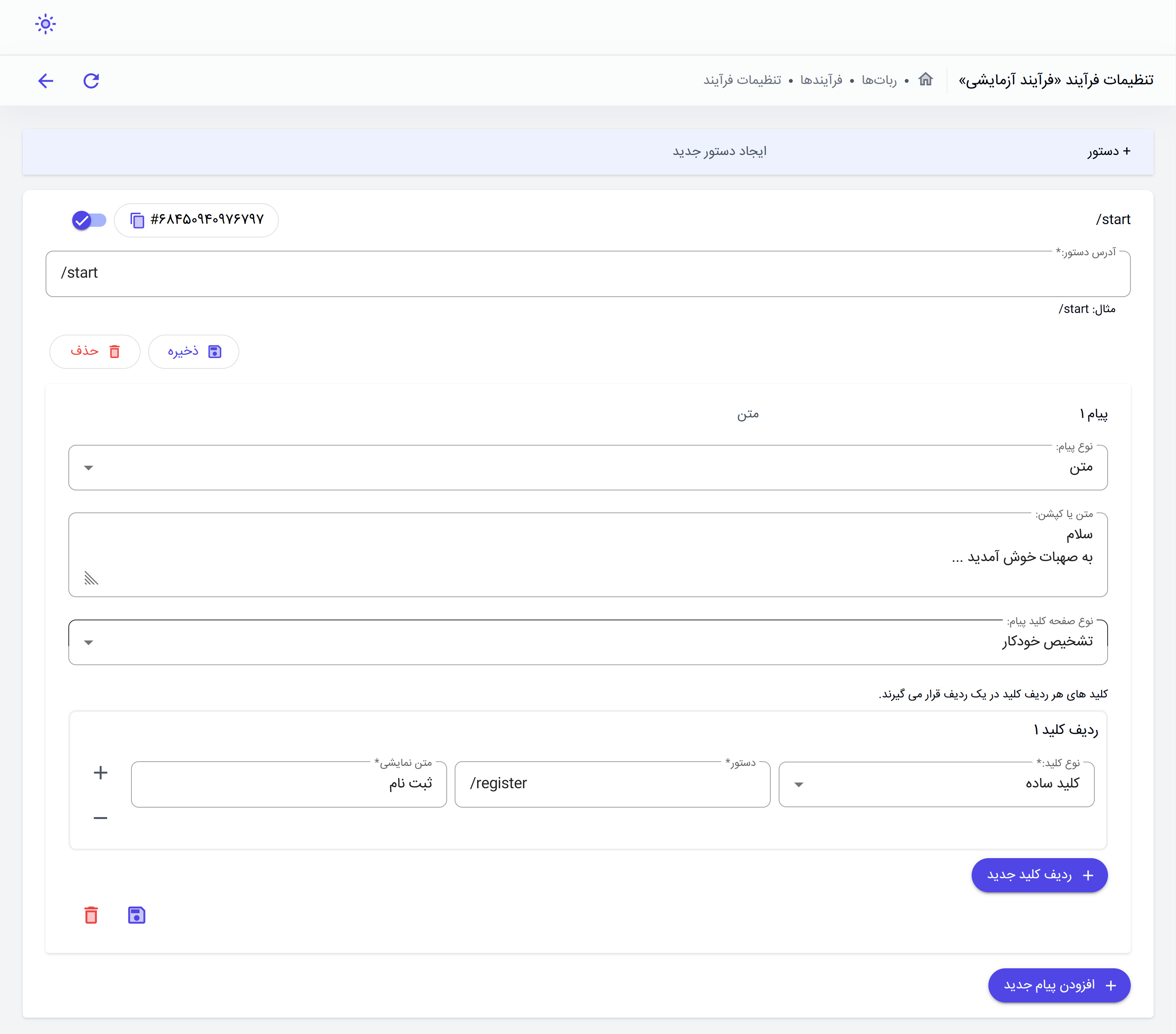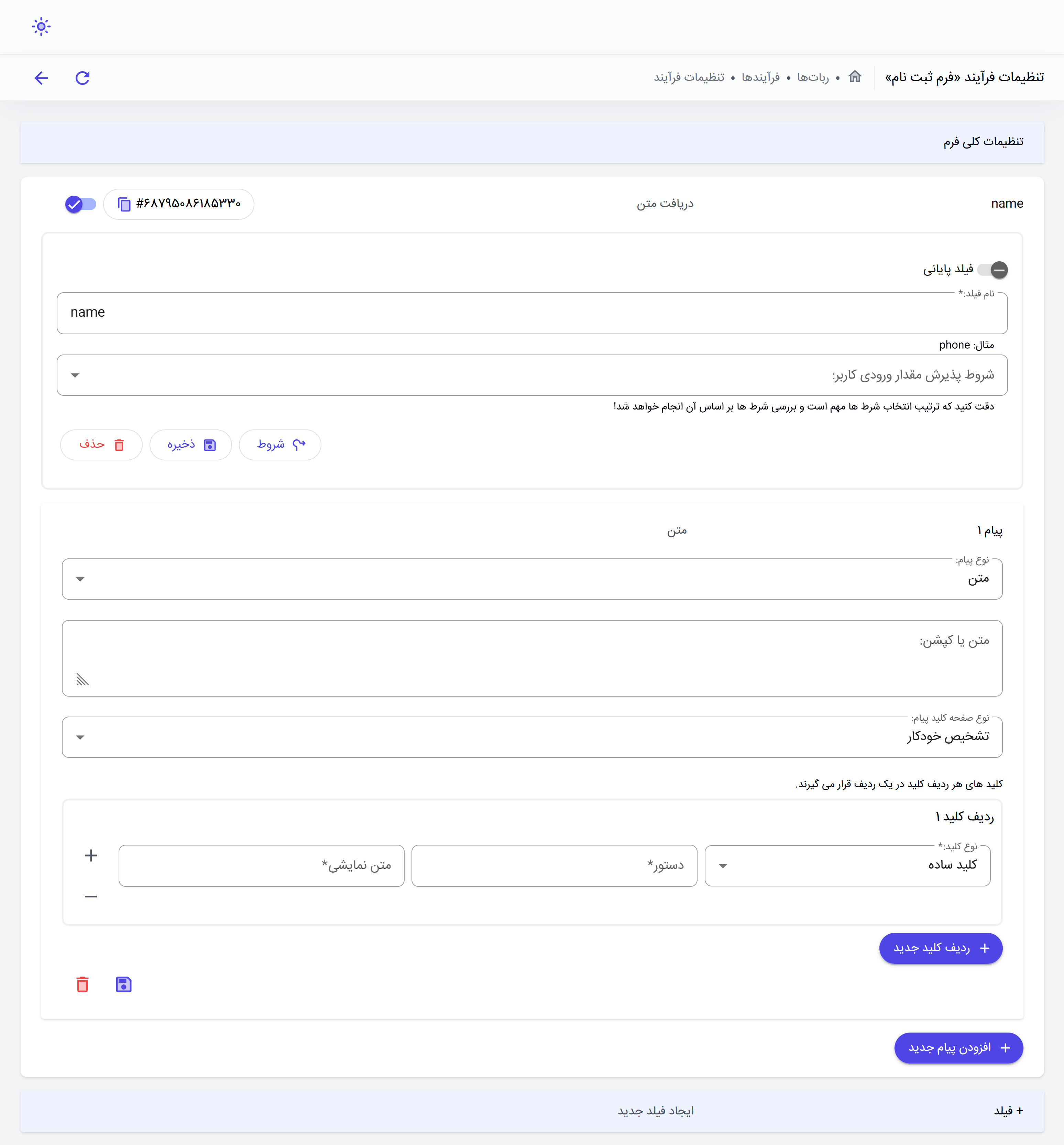 این فرآیند به صورت یک متن ساده یا متن با پیوست فایلها، موقعیت مکانی، اطلاعات مخاطب و یا استیکر عمل میکند. میتوانید به انتهای پیام کلیدهای متنوعی نیز اضافه نمایید که کاربر را به فرآیند یا دستور دیگر هدایت نماید. یا از کاربر درخواست شماره تماس و موقعیت مکانی بکند. پس از تکمیل قسمتهای ستارهدار، فرآیند را ذخیره نمایید.