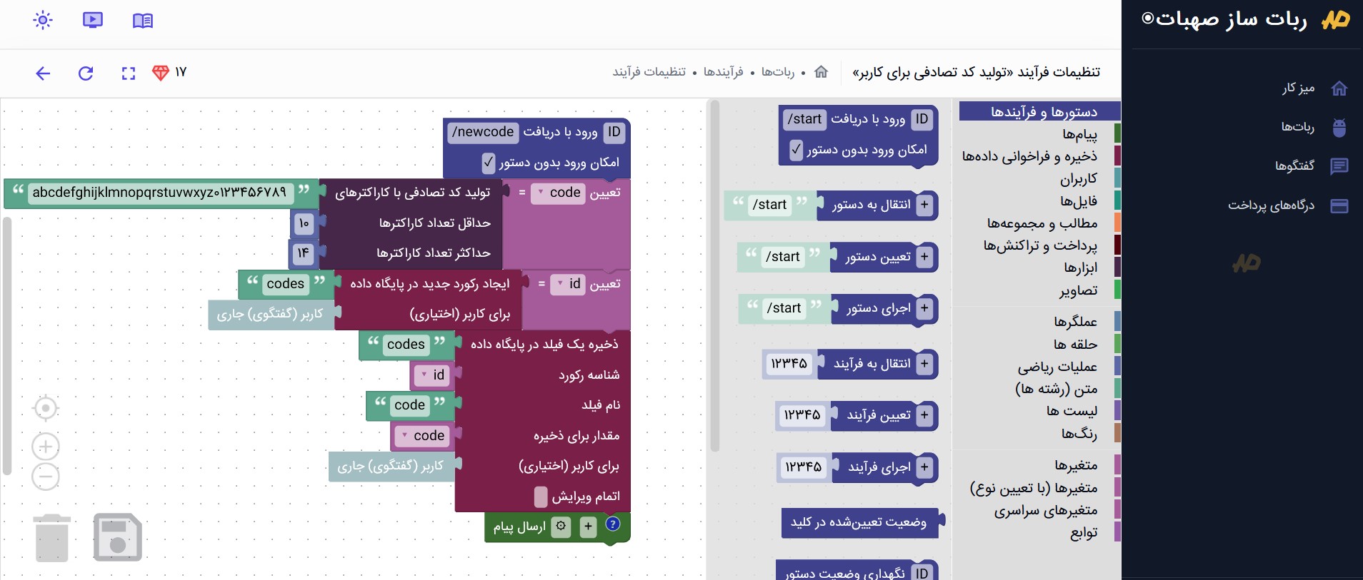 توجه داشته باشید که چند نمونه از رباتهای قابل ساخت در سایت اصلی معرفی شدهاند. همچنین میتوانید در محیط کاربری صهبات، از بلوکهای فرآیند پیشرفته کپی کنید. در آینده امکان کپی برداری از رباتهای نمونه نیز فراهم خواهد شد.
