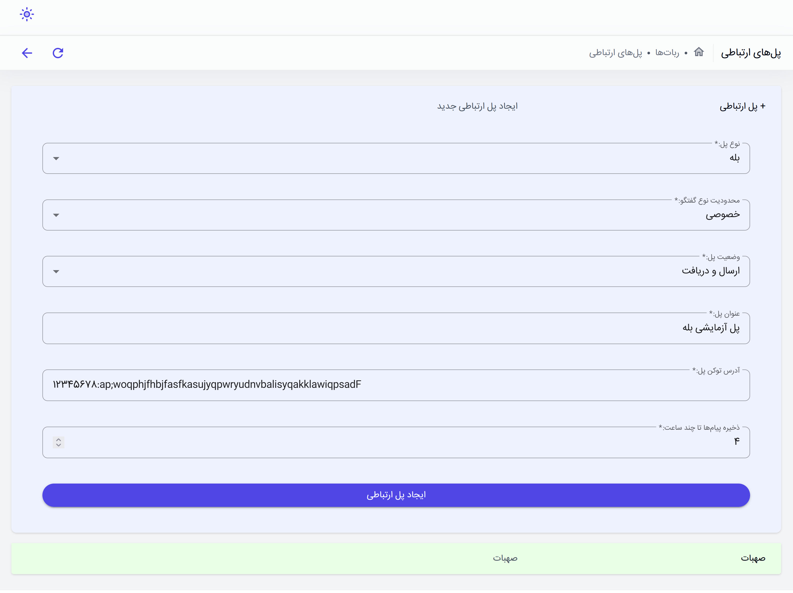 در این قسمت به طور پیش فرض برای حساب کاربری شما یک پل صهبات وجود خواهد داشت. این به این معنی ست که حتی اگر شما تمایلی به اتصال ربات مورد نظرتان در پیامرسان نداشته باشید، میتوانید ربات خود را به صورت نسخه وب در صهبات با تمام امکانات و صفحههای گفتگو داشته باشید.