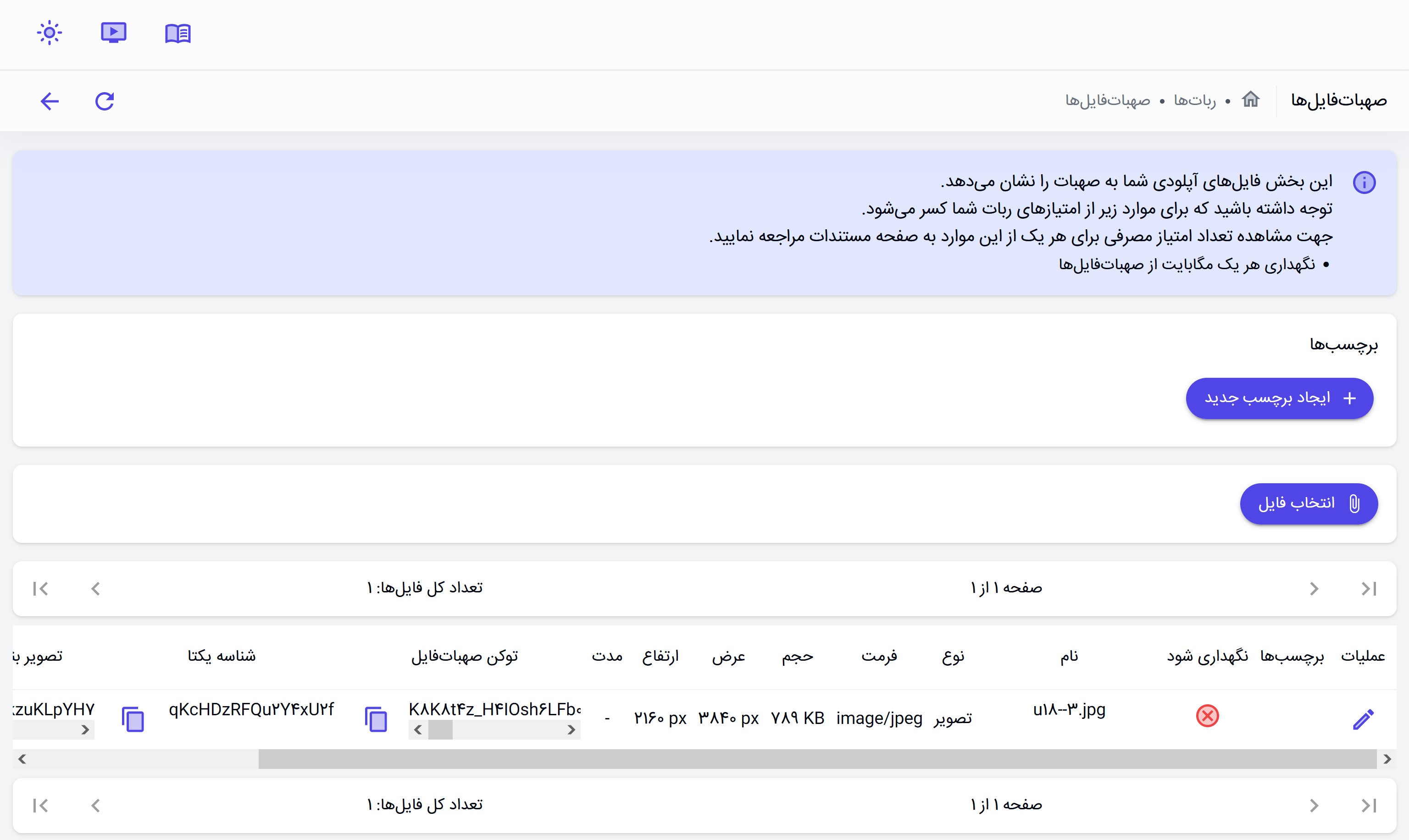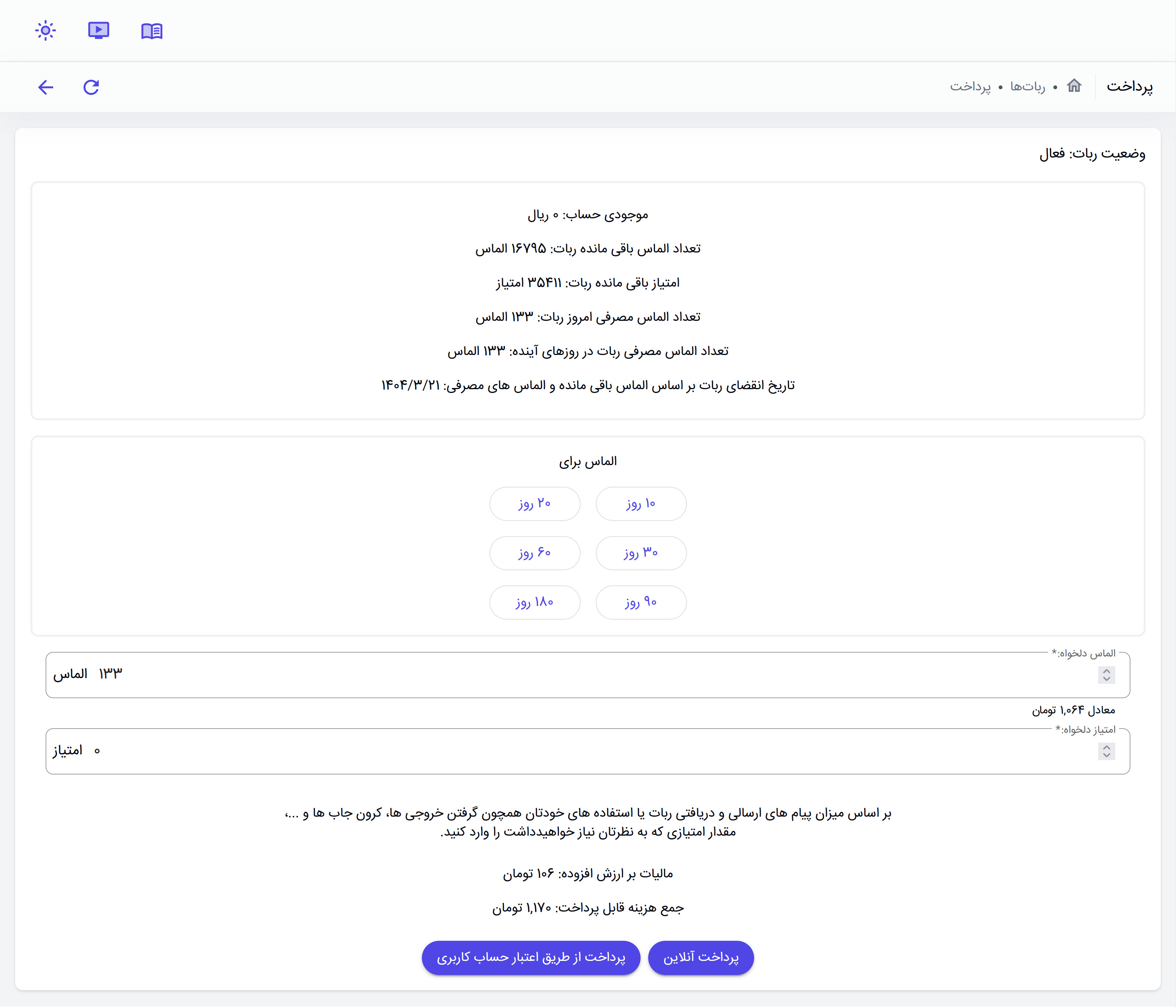 اما نگران محاسبه الماس و امتیاز برای کارکرد روزانه ربات خود نباشید! صهبات به صورت خودکار الماس و امتیاز مورد نیاز بنابر منابع و امکانات مصرفی ربات دلخواه شما را محاسبه و در قسمت رباتها نشان میدهد. همچنین تاریخ پیشبینی شده برای افزایش موجودی را نیز میتوانید مشاهده کنید. مصرف الماس به صورت روزانه و امتیاز هنگام مصرف از جمع موجودی کسر میشوند تا اگر در حال ساخت ربات هستید، مشکلی ایجاد نشود. در انتهای روز هم امتیاز مصرفی پیامها، فایلها و ... نگهداری شده محاسبه و از جمع موجود کسر خواهد شد.