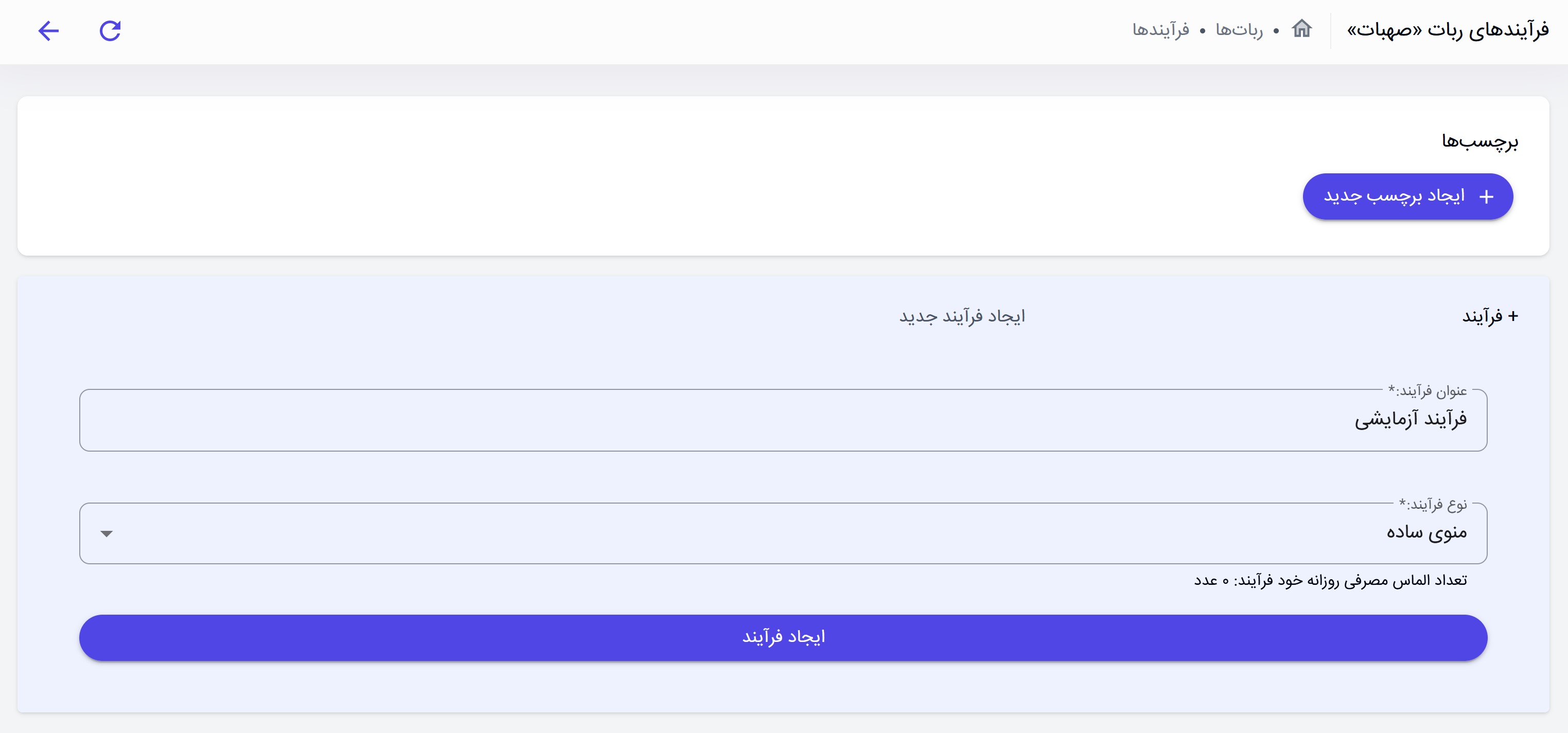 یکی از مهمترین بخشهای رباتساز که ساختار کلی عملکرد ربات در آن تنظیم میشود فرآیندها است. با ورود به فرآیندها دو گزینه اصلی ایجاد برچسب جدید (که برای تمایز فرآیندهای مختلف به کار میرود) و ایجاد فرآیند جدید مشاهده میشود.