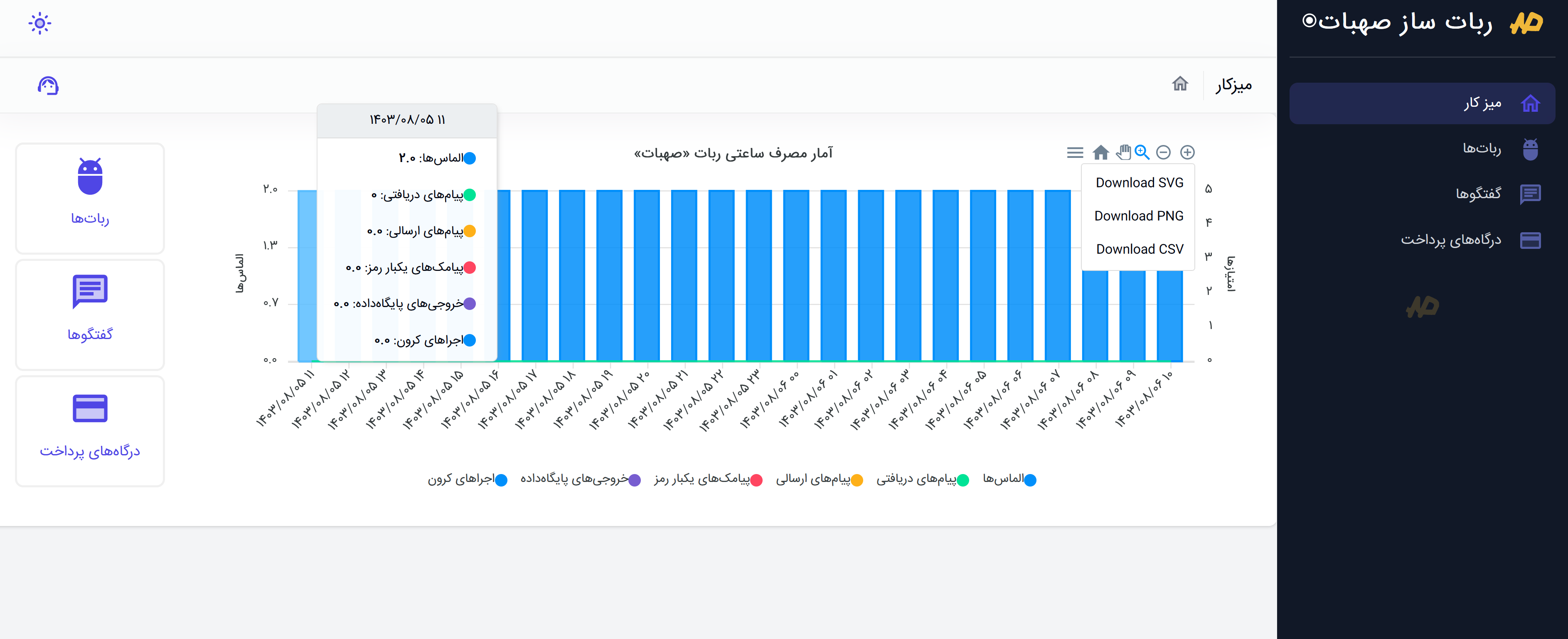 این قسمت به صورت پیشفرض به هنگام ورود به محیط کاربری نمایش داده خواهد شد. در میز کار علاوه بر امکان ورود به بخشهای دیگر، میتوانید آمار رباتهای خود را به صورت نموداری مشاهده کنید. قابلیت نمایش متغیرهایی مانند الماس، پیامهای دریافتی، پیامهای ارسالی، پیامکهای یکبار رمز، خروجیهای پایگاههای داده و اجراهای کرون را با امکان شخصی سازی آنها وجود دارد. همچنین میتوانید در صورت نیاز، از نمودار خود خروجی svg، png و csv بگیرید. میتوانید با انتخاب آیکن پشتیبانی در سمت چپ میزکار، درخواست ساخت ربات، گزارش خطاها، گزارش محتوای نامناسب، مشکلات تراکنش و حساب مالی و پیشنهادات و انتقادات خود را مطرح کنید.